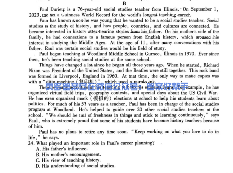 Paul Duriel? is a 76-year-oldstudies teacher from lllinois."On September 1.socia2023 ,me set a Uuinness World Record for the world's longest teaching career.Paus has knowm since he was young that he wanted to be a social studies teacher. Soriasludies is the study ot history, and how people, countries, and cultures are connected, Hebecame interested in history atter earing stories from his father, On his mother's side of thefamily,he had conneclions to a famous person from English history. which aroused higin studying the Middle Ages. At the age of 1l,after many conversations with hisinterestwould be his field of study.lather.Pau wascerainsocia studiesPaul began teaching at Woodland Middle School in Gumee, lllinois in 1970. Ever sincethen. he's beenteaching social studies at the same schoolThings have changed a lot since he began all those years ago, When he started. RicharcNixon was President of the United States , and the Beatles were still together. This rock bandwas formed in Liverpool, England in 1960. At that time, the only way to make copies wa!with a“ditto machine(复臼机)",which used a purple ink.There're many activities in his teaching to help his students learn. For example. he hasorganized virtual field trips .bhy contests. and special days about the US Civil War.He has exen organized mock(拟的)elections at school to help his students leam aboupolitics. For much of his 53 vears asa teacher, Paul has been in charge of the social studiesprogram at Woodland, He's helped to guide over 20 other social studies teachers at theschool, “ We should be tull of freshness in things and stick to leaming continuously," saysPaul , who is extremely proud that some of his students have become history teachers becauseof him.Paul has no plans to retire any time soon, “ Keep working on what you love to do inlife ." he says.